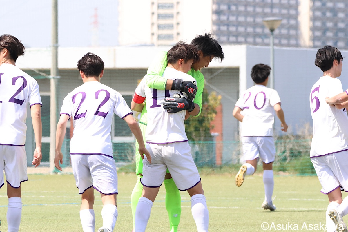FW鹿取勇斗(4年/桐光学園高)の同点弾を喜ぶGK波多野崇史(4年/サンフレッチェ広島F.Cユース)