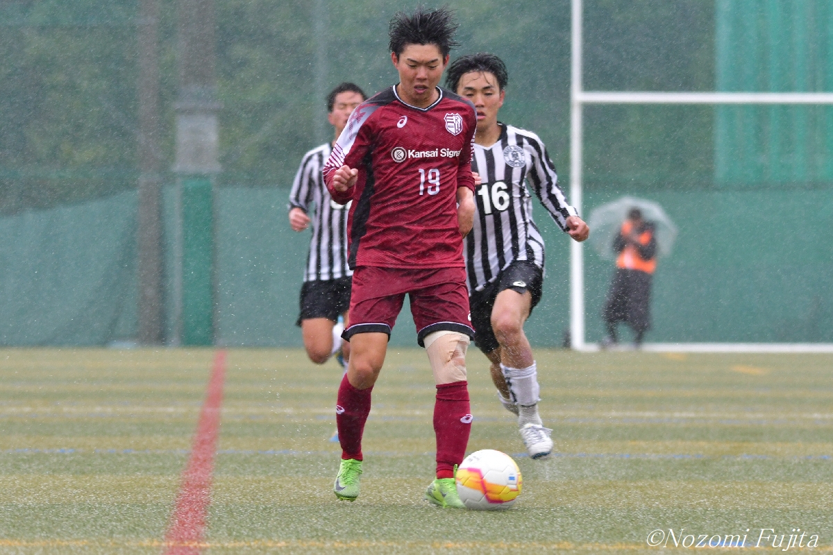 立命大DF加藤寛人(4年/高川学園高)は積極的に相手陣内に入り込み、攻撃をサポート