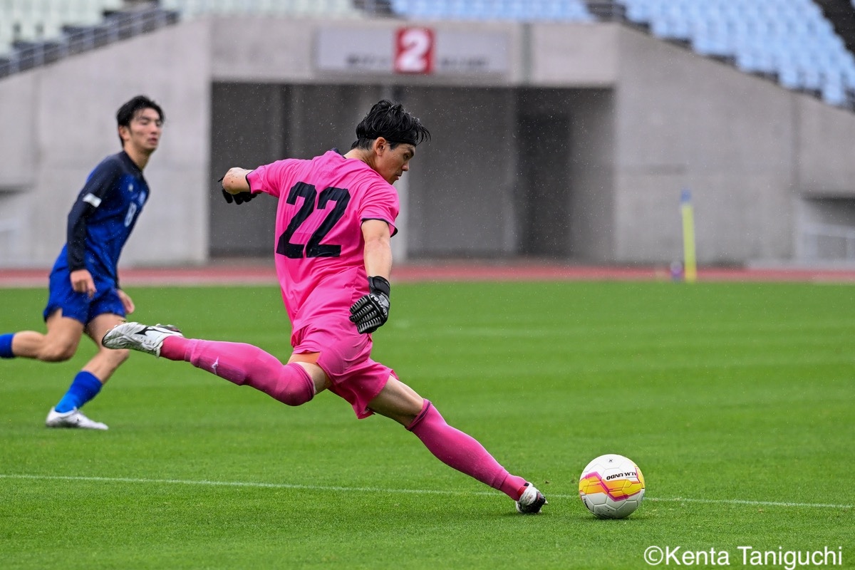 前線にボールを供給する関国大GK重松利希(4年/作陽高)