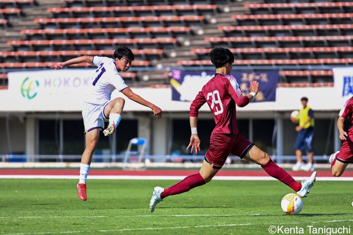 ロングシュートでゴールを狙うFW日笠蓮康(2年/ガンバ大阪ユース)