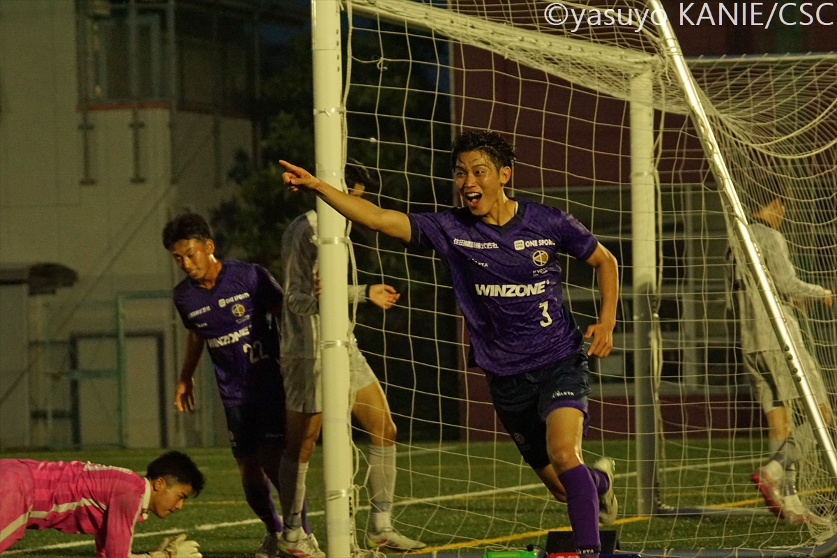 京都橘大DF宮嶋大輝(4年/京都橘高)が先制弾を決めてガッツポーズ