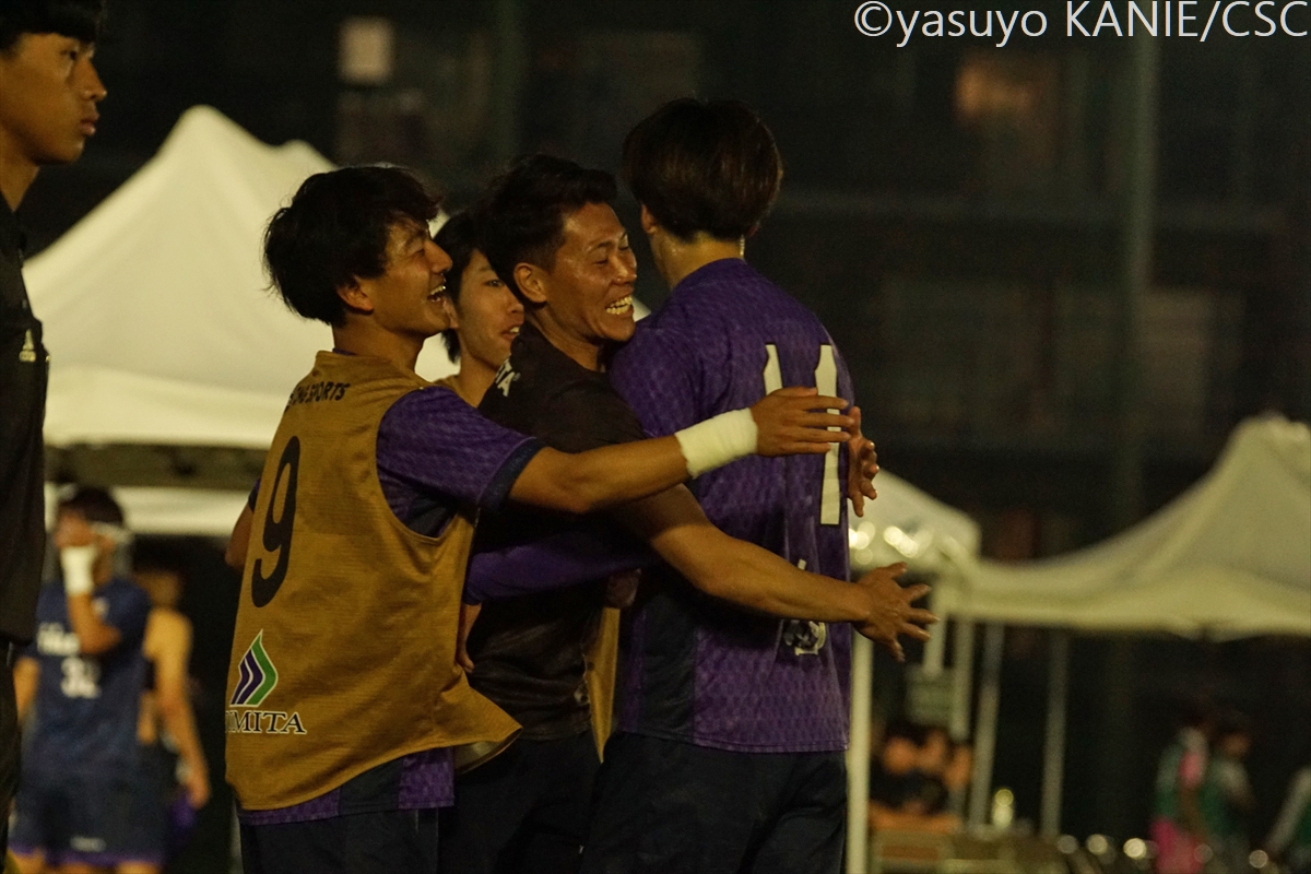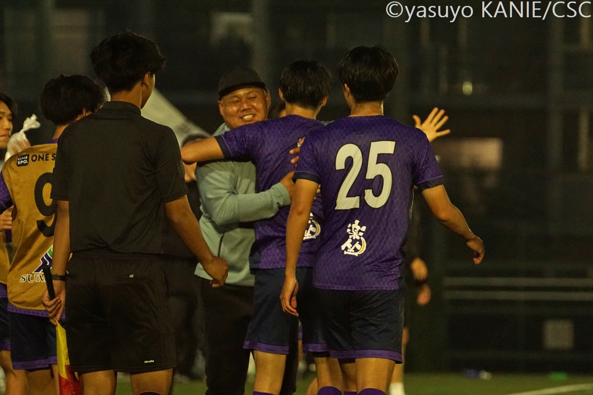 京都橘大・橋詰広太郎監督もゴールの宮嶋を笑顔で迎える