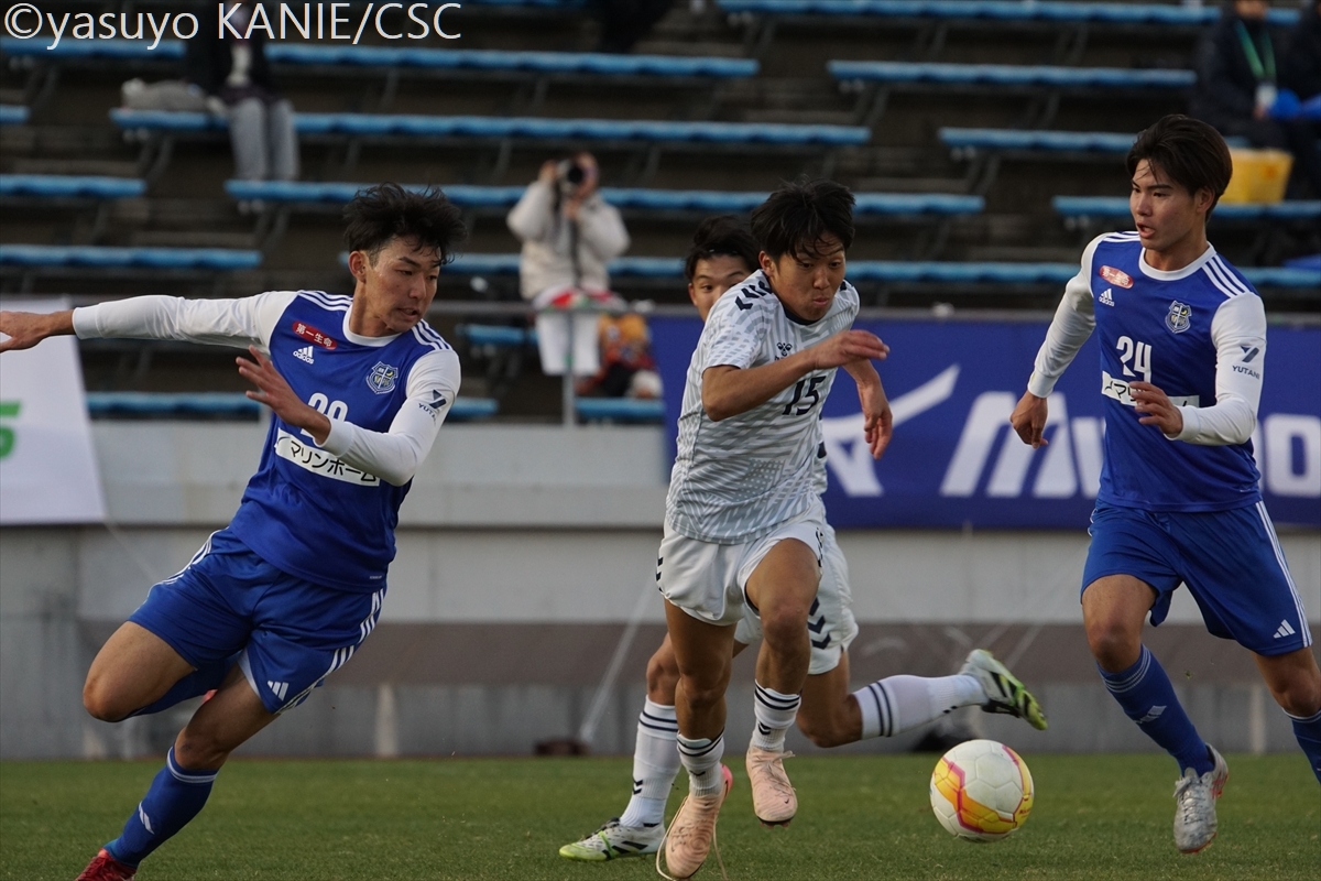 高松大MF矢野瑛吉(3年/立正大学淞南高)がスペースでボールを受けると前へ
