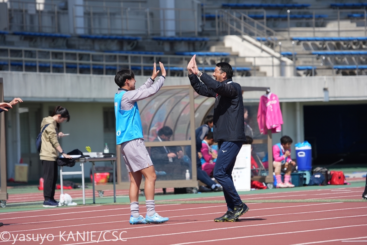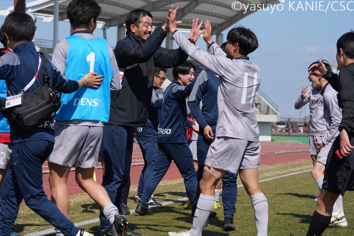 東海選抜・永冨裕也監督(中京大)も、追加点を決めたMF香川をハイタッチで迎える